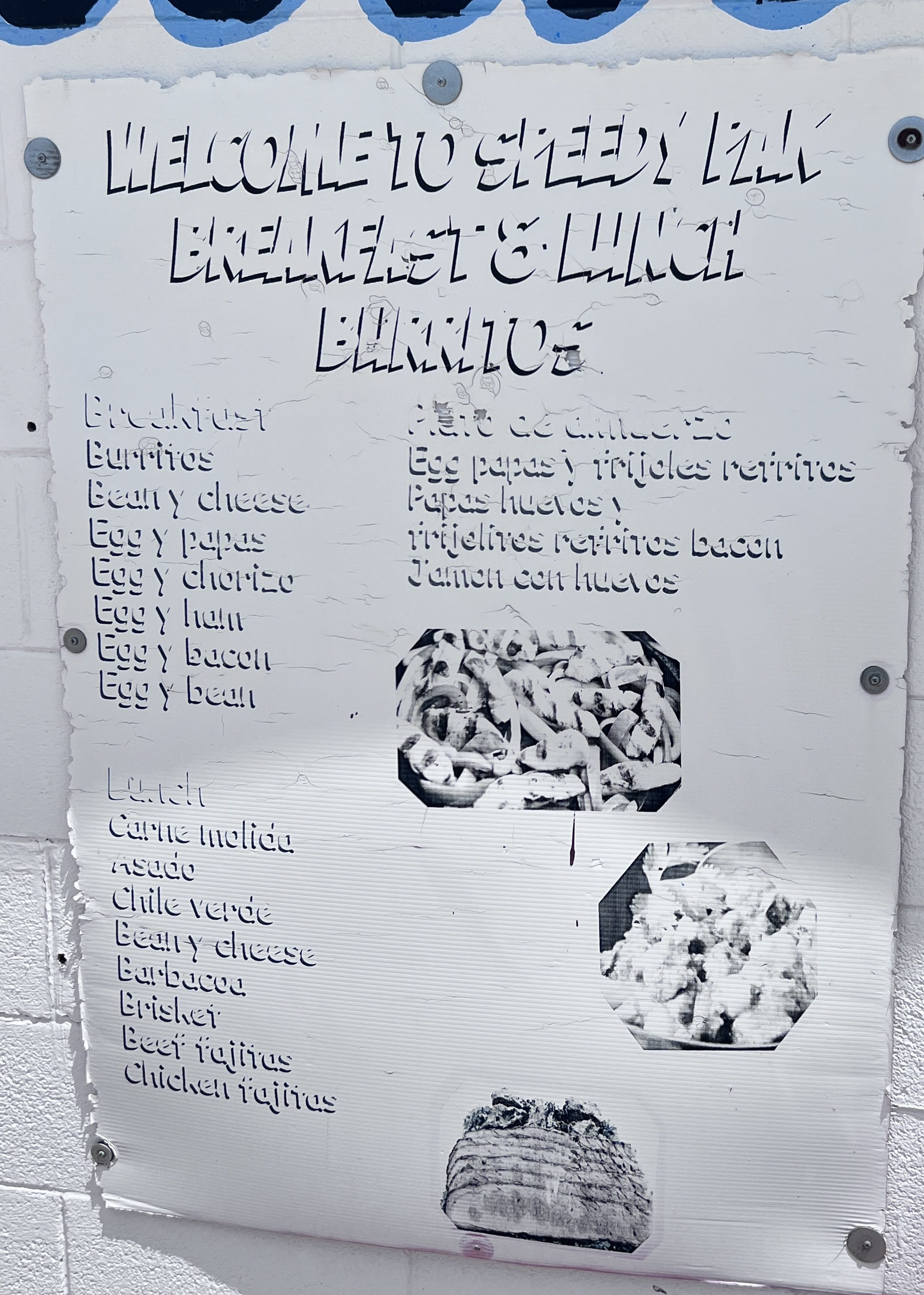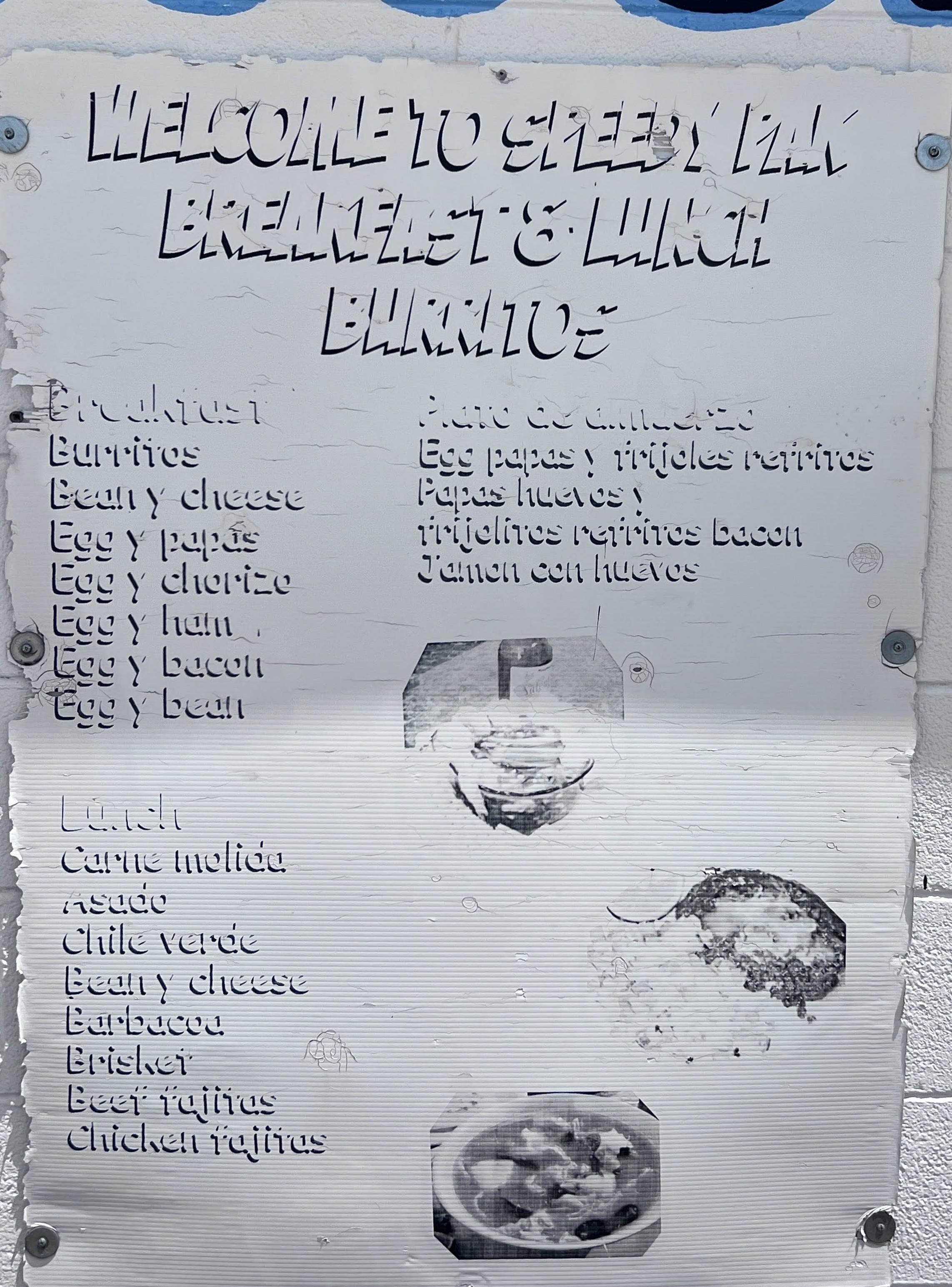The breakfast menu is simple but satisfying, featuring burritos filled with staples like bean and cheese, egg and potato, egg and chorizo, egg and ham, egg and bacon, and egg and bean. They also offer breakfast plates such as huevos rancheros, egg and potato with beans, or jamón con huevos. For lunch, the lineup includes Mexican favorites like carne molida, asado, chile verde, barbacoa, brisket, and both beef and chicken fajitas, all available in burrito form or as plates.