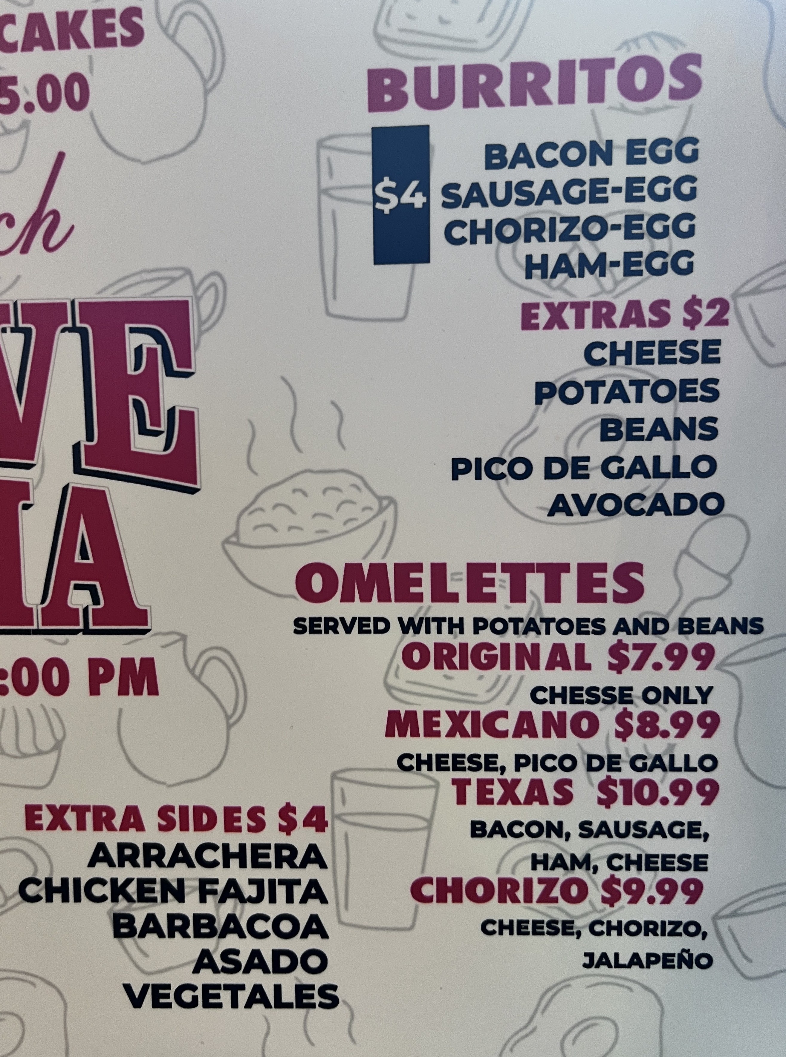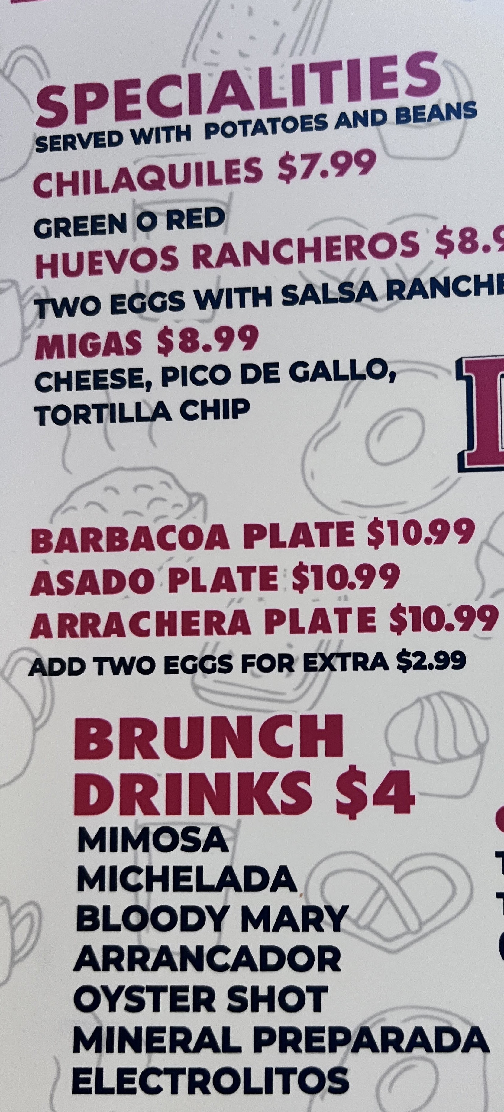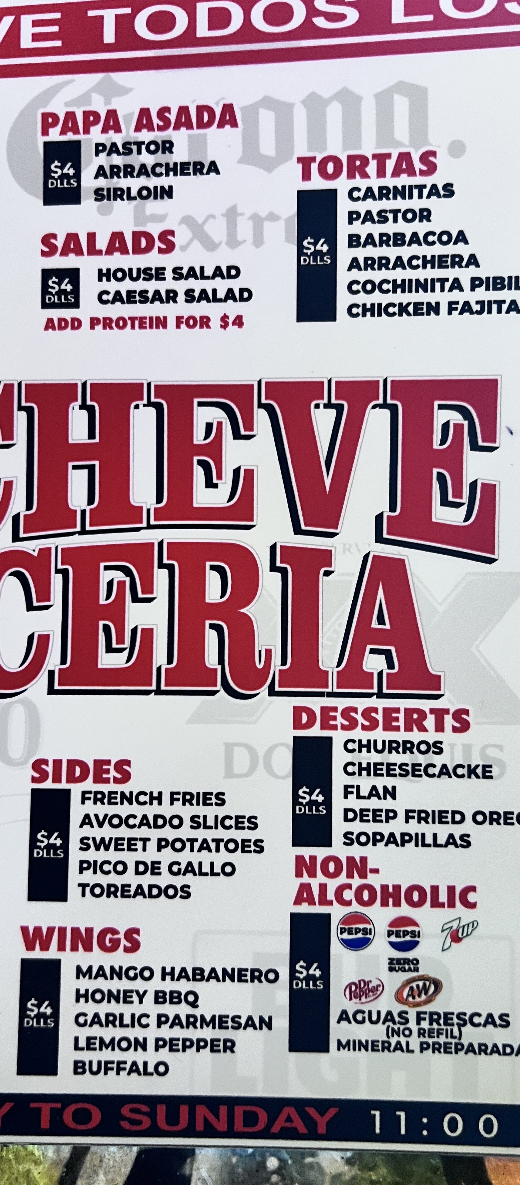 The food menu reads like a greatest hits of Mexican comfort fare, all priced so you can graze without breaking the bank. Tacos and burritos—$4 each—come piled high with your choice of pastor, asado, carnitas, arrachera, cochinita pibil, tripas and more, while quesadillas, tortas and “Papa Asada” platters land in that same price bracket. If you’re extra hungry, the “Cheve Plate” ($12.99) delivers two eggs, potatoes, pancakes and your choice of bacon, sausage or ham. On the lighter side, shareable flautitas, fried cheese curds or loaded “mini nachos” make the perfect bar bites, and sides range from fries and avocado slices to pico de gallo and toreados.