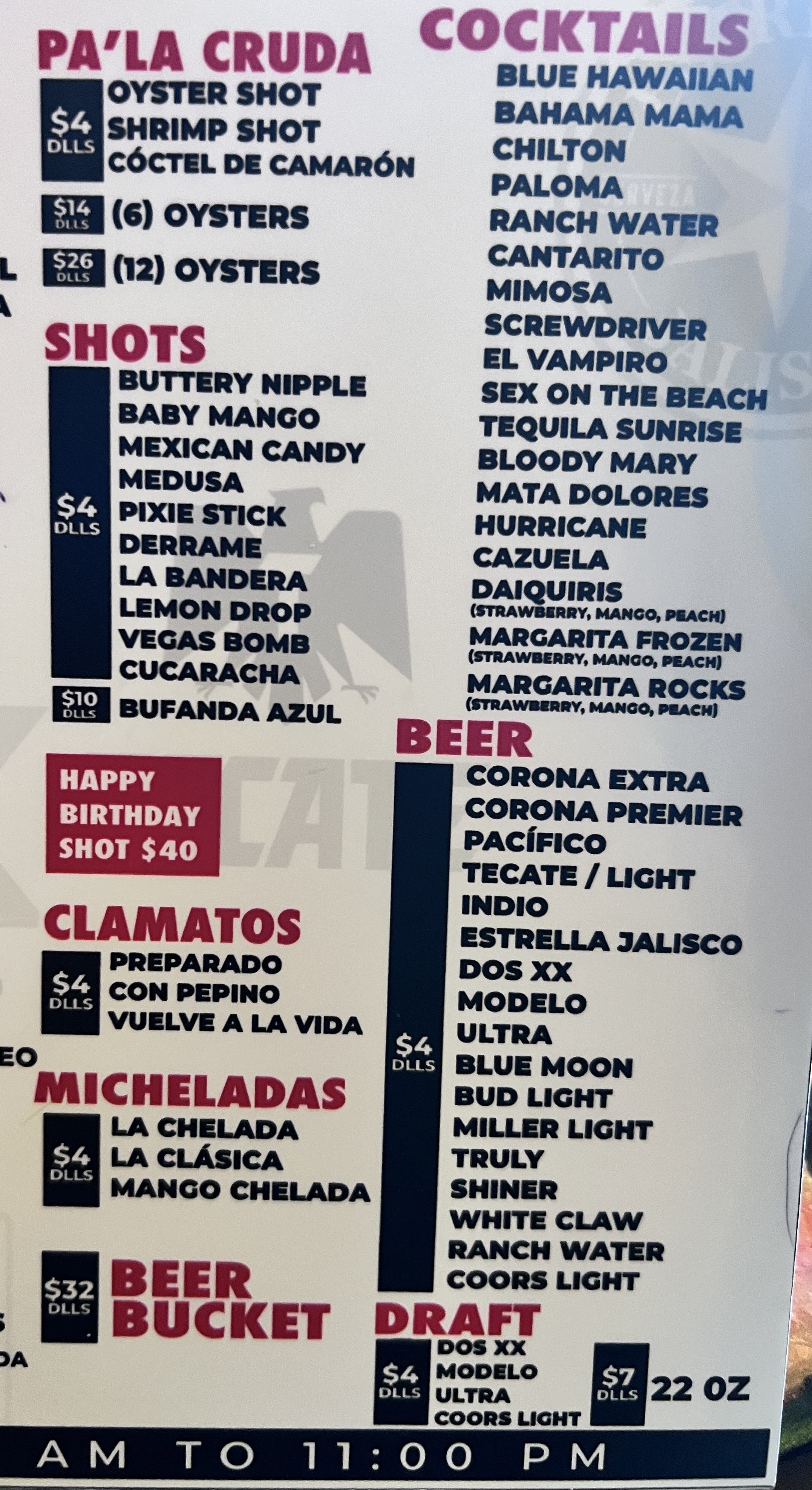 Where La Cheve‑ceria really shines is its drink selection. Beyond draft and bottled beers (Dos XX, Modelo, Coors Light, Pacifico, Estrella Jalisco), the bar pours fresh aguas frescas, a rotating roster of margaritas (frozen and on the rocks), Ranch Water, Palomas and even Bahama Mamas. Shot aficionados will clamor for house specialties like the Buttery Nipple, Baby Mango or the “Bufanda Azul,” while seafood lovers can order raw oysters or a shrimp shot “Cóctel de Camarón” for a briny kick. And if you’re craving something at brunch hour, the weekday specials—chilaquiles, huevos rancheros or migas served with beans and potatoes—keep the party going well into the early afternoon.