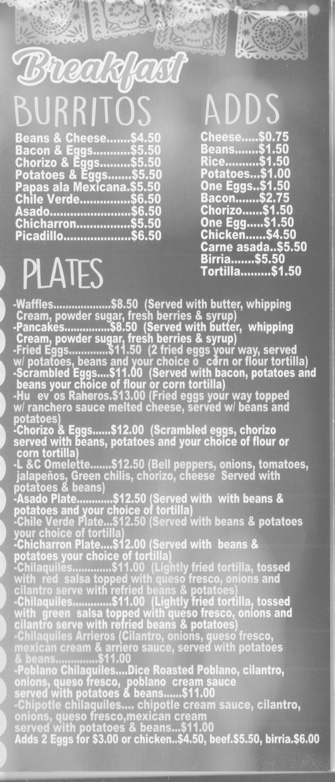 Come mid‑morning, the menu blossoms: huevos rancheros ($13), chilaquiles in red or green sauce ($11), and a hearty L & C omelette ($12.50) bursting with bell peppers, jalapeños, chorizo and cheese all come served with beans and potatoes. For those who like to build their own, a la carte add‑ons—extra eggs, meats like carne asada or birria ($5.50 each), or even a cup of fresh‑pressed corn tortillas ($1.50)—make it easy to customize every plate. And don’t miss the Molletes ($8.50), crisp bolillo halves loaded with beans, Oaxaca cheese and pico de gallo, or the spicy carne asada fries ($10.50) for a late‑morning pick‑me‑up.