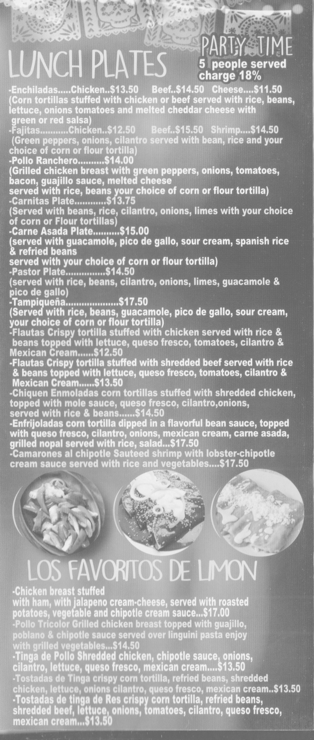 When lunchtime rolls around—up to 3 PM daily—Limón con Chile #2 shifts into full flavor mode. Enchiladas come in chicken, beef or cheese (starting at $11.50), while fajitas (chicken $12.50, beef $15.50, shrimp $14.50) sizzle at the table with peppers, onions and your choice of tortillas. The “Los Favoritos de Limón” section introduces house specialties like ham‑and‑jalapeño‑cream‑cheese–stuffed chicken breast ($17) or tricolor pollo topped with guajillo‑poblano sauce over linguine ($14.50)—a playful nod to fusion. Seafood lovers can splurge on camarones al chipotle or enfrijoladas draped in mole, each plate artfully garnished and served with rice and beans.