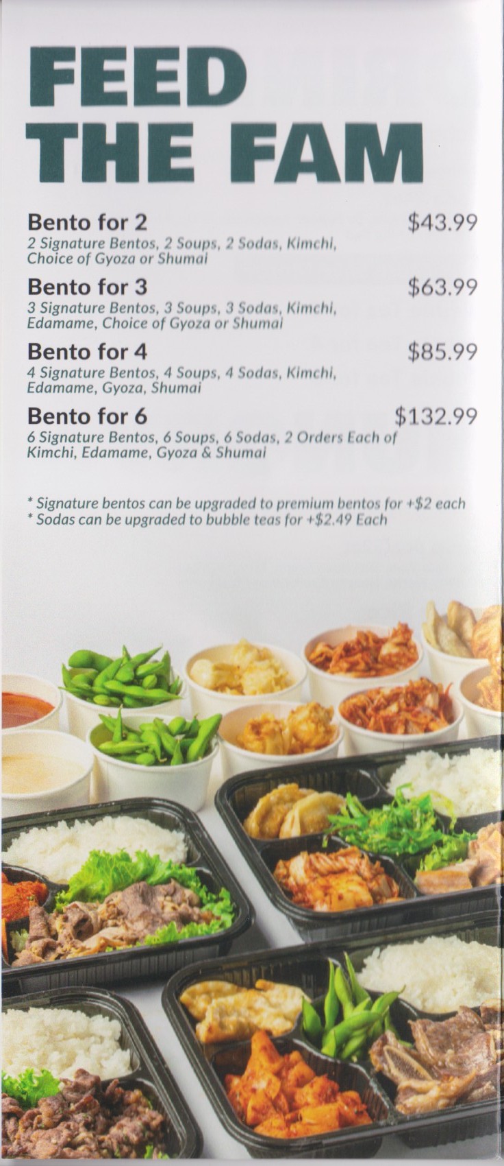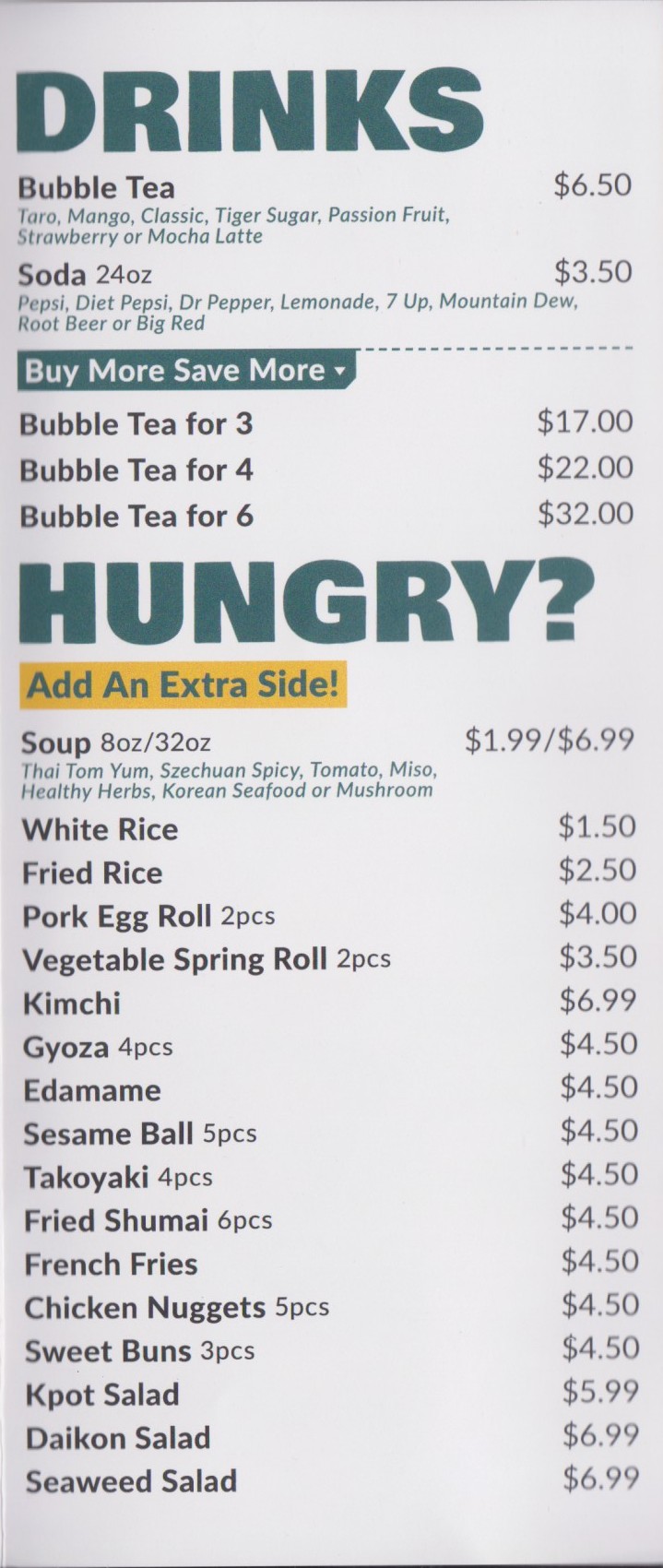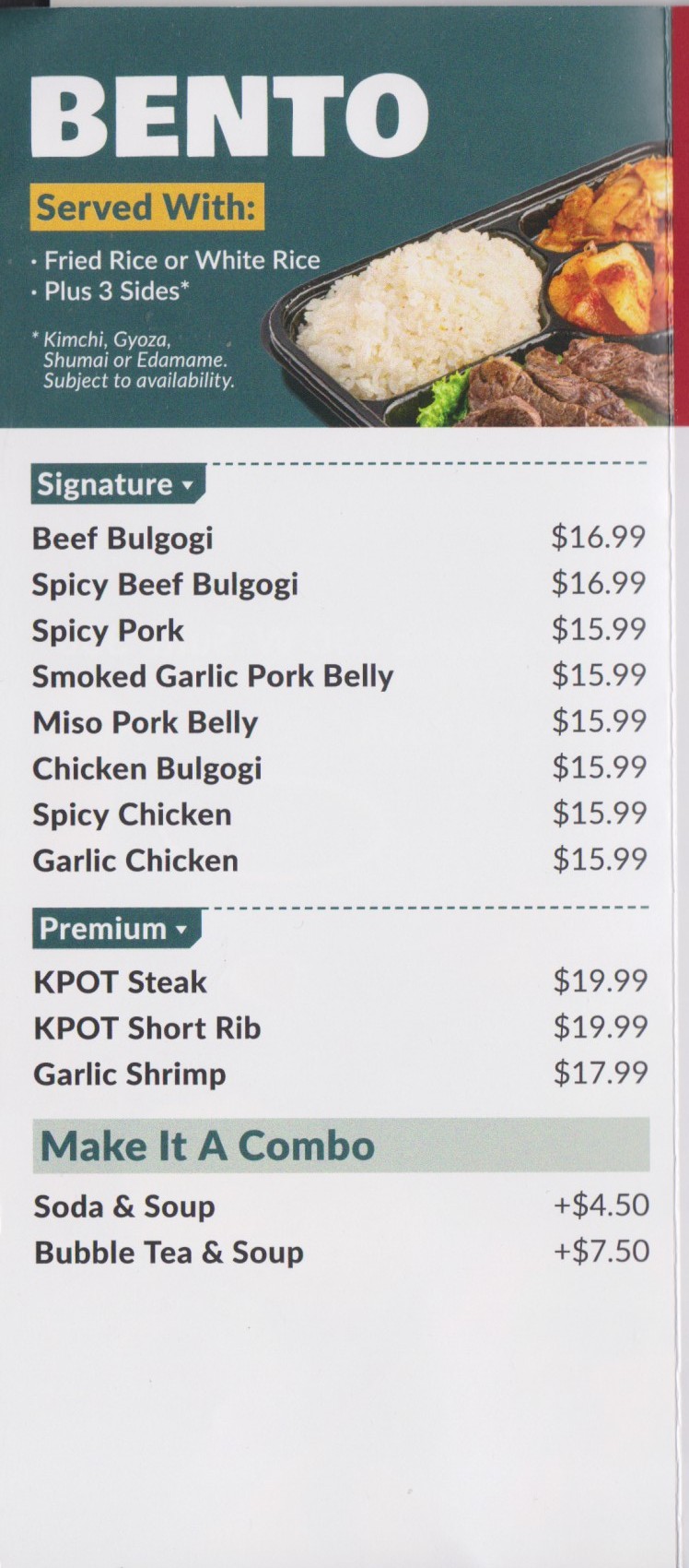 The menu is extensive, featuring bento boxes, signature and premium hot pots, and an array of à la carte sides. Bento options include customer favorites like Beef Bulgogi, Spicy Pork, and Garlic Chicken, each served with rice and three sides such as kimchi, gyoza, shumai, or edamame. For hot pot lovers, there’s a choice of soup bases—from the spicy kick of Szechuan to the savory richness of miso or Korean seafood—paired with noodles or rice and seasonal vegetables. Add-ons like shrimp, sliced ribeye, and quail eggs allow for endless customization.