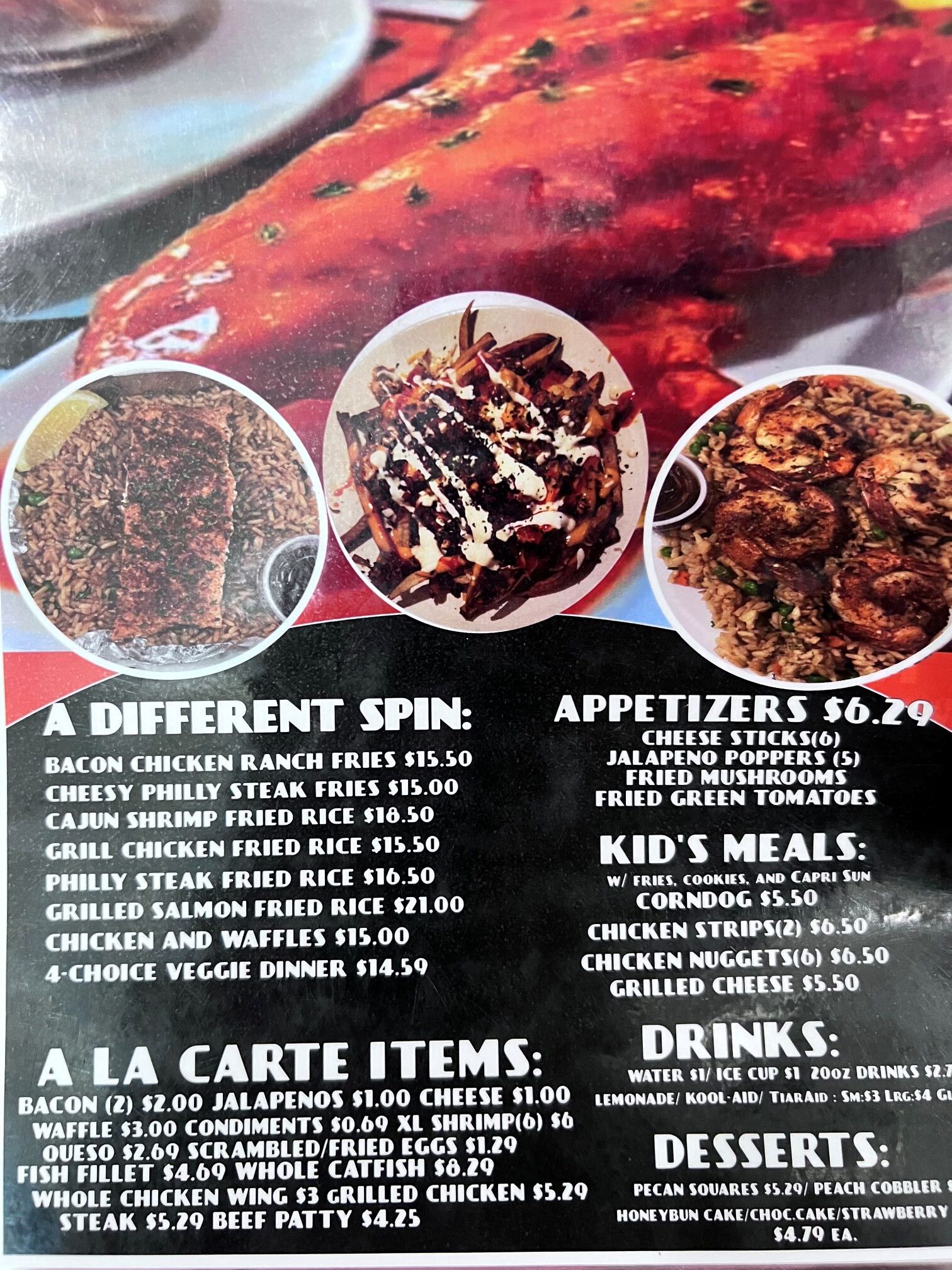 The menu features “The Classics,” such as fried catfish fillets, XL hand-dipped shrimp, pork chops, chicken wings, and chicken fried steak, each served with a choice of two sides from an impressive selection. Guests can pick from Southern favorites like fried okra, collard greens, candied yams, mac and cheese, and grilled potatoes with onions and peppers. Burgers, po’ boys, and sandwiches round out the offerings, while “A Different Spin” section showcases creative plates like bacon chicken ranch fries, Cajun shrimp fried rice, and chicken and waffles.