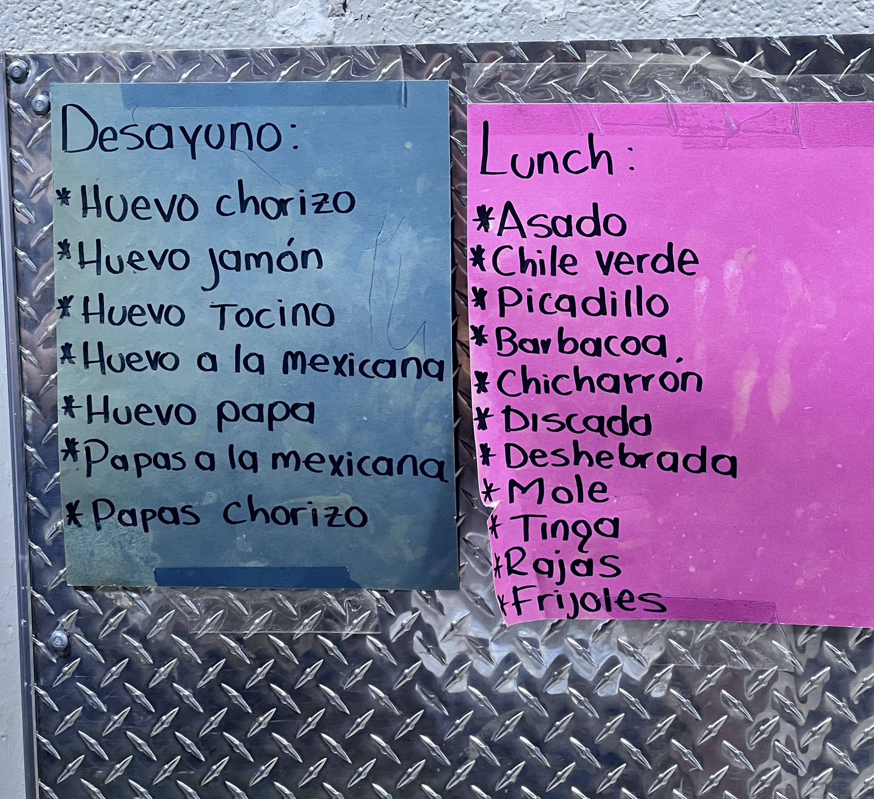 The breakfast menu, served from the crack of dawn, features a variety of egg-based dishes paired with savory fillings like chorizo, ham, bacon, potatoes, and Mexican-style vegetables. Favorites include huevo a la mexicana, papas chorizo, and papas a la mexicana—perfectly complemented by warm, fresh tortillas straight from their kitchen. At lunchtime, the menu expands to a robust selection of meats and stews, including asado, chile verde, picadillo, barbacoa, chicharrón, and discada, alongside specialties like deshebrada, mole, tinga, and rajas. For a lighter option, frijoles make a simple yet flavorful choice.
