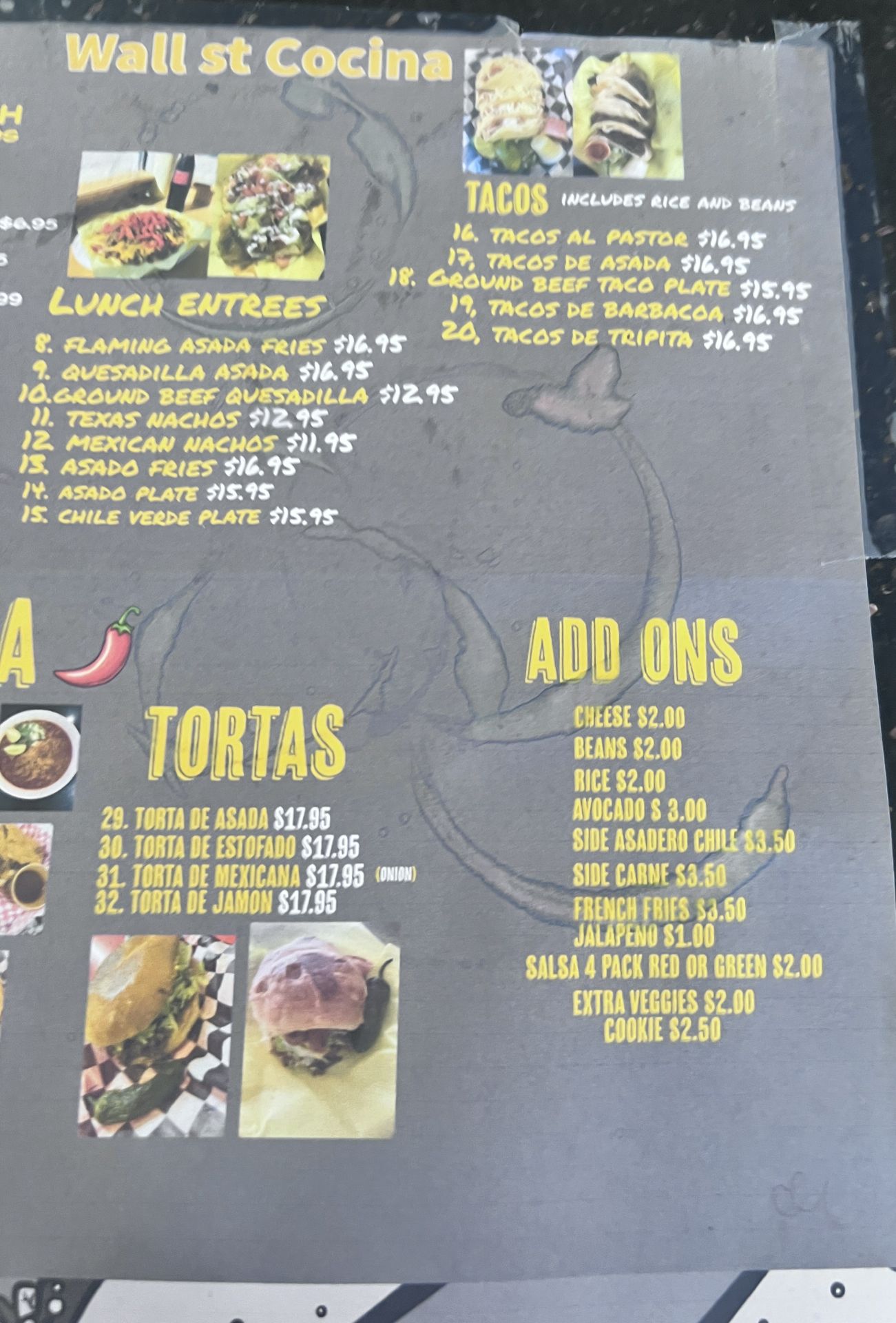 For sandwich lovers, Wall St. Cocina’s tortas are a highlight—packed with fillings like asada, estofado, jamón, or the Mexicana with fresh onion. Add-ons such as avocado, jalapeños, side carne, and their house salsas let diners customize their plates. With prices in the $10–$20 range and a focus on robust, satisfying meals, Wall St. Cocina delivers authentic Mexican comfort food with plenty of variety, making it a local favorite for both quick bites and indulgent lunches.